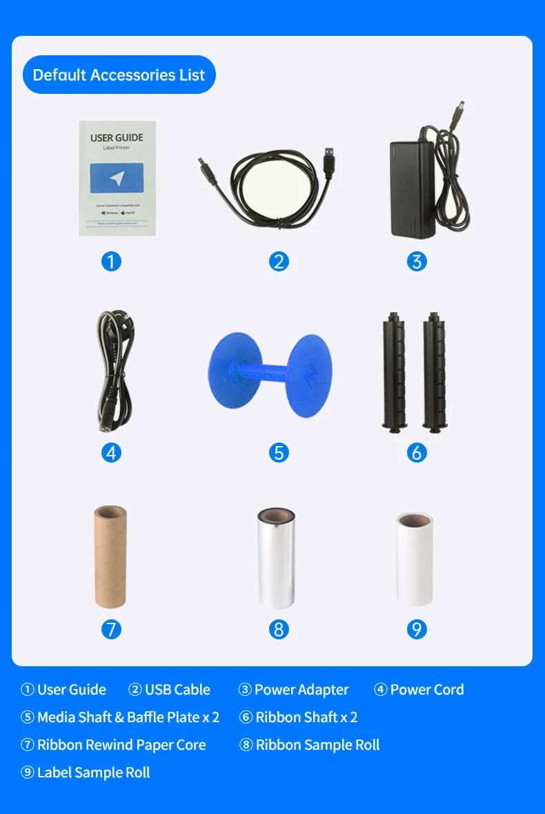- Fonte de alimentação de comutação universal externa, aba de fixação x 2, adaptador de núcleo de 1,5” x 2, eixo de fita x 2, núcleo de papel de fita