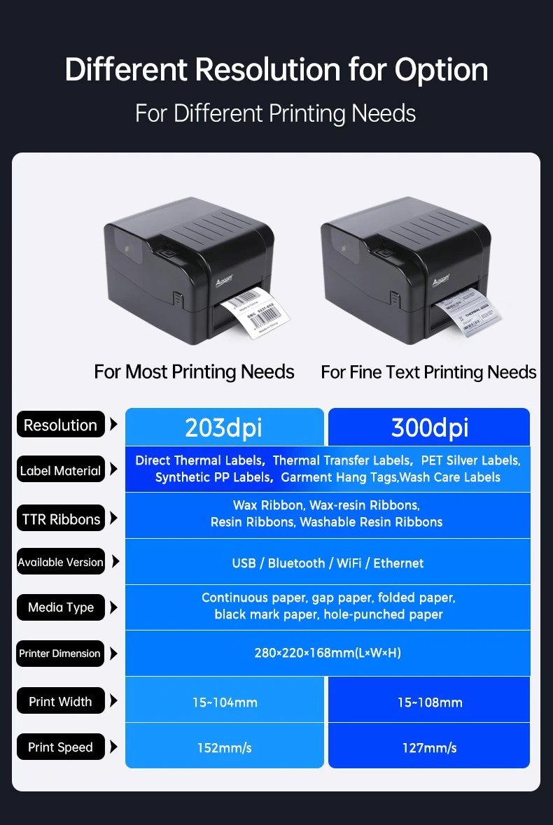Resolução de 203 dpi ou 300 dpi para opção